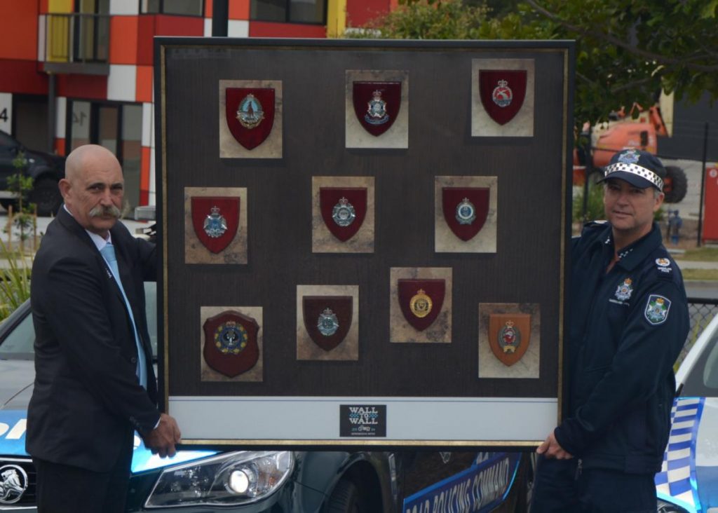 One of our Wall to Wall Ride participants (Mark Tull from Website Essentials) has donated a fully wood framed and glassed piece that contains 10 Police plaques from the various state and territory jurisdictions, including PNG and NZ Police Services. The individual plaques have been mounted to respectfully mimic the National Police Memorial wall design. The plaque also displays the 2016 Wall to Wall Ride for Remembrance logo.